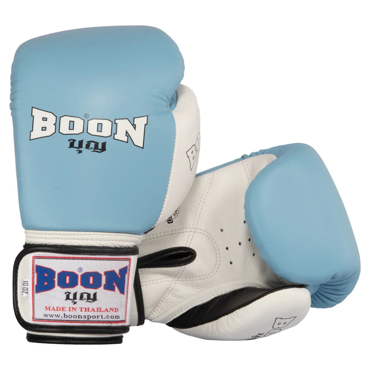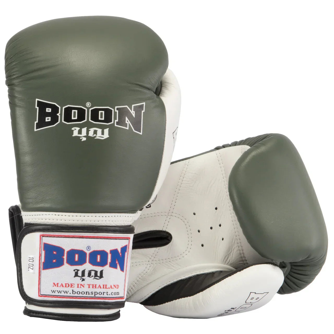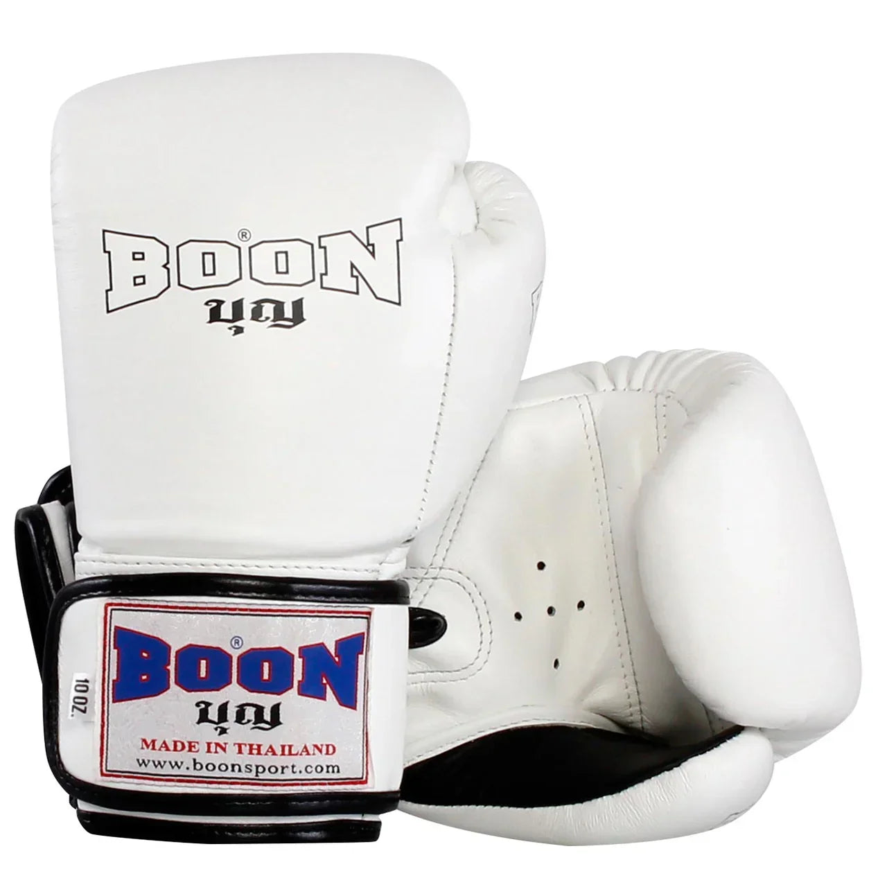 Featuring premium quality leather, high quality stitching and dense three layer foam, these gloves are built to last through all types of Muay Thai and boxing training. The Boon logo is set across the back of the hand and thumb section.